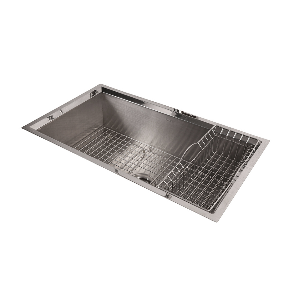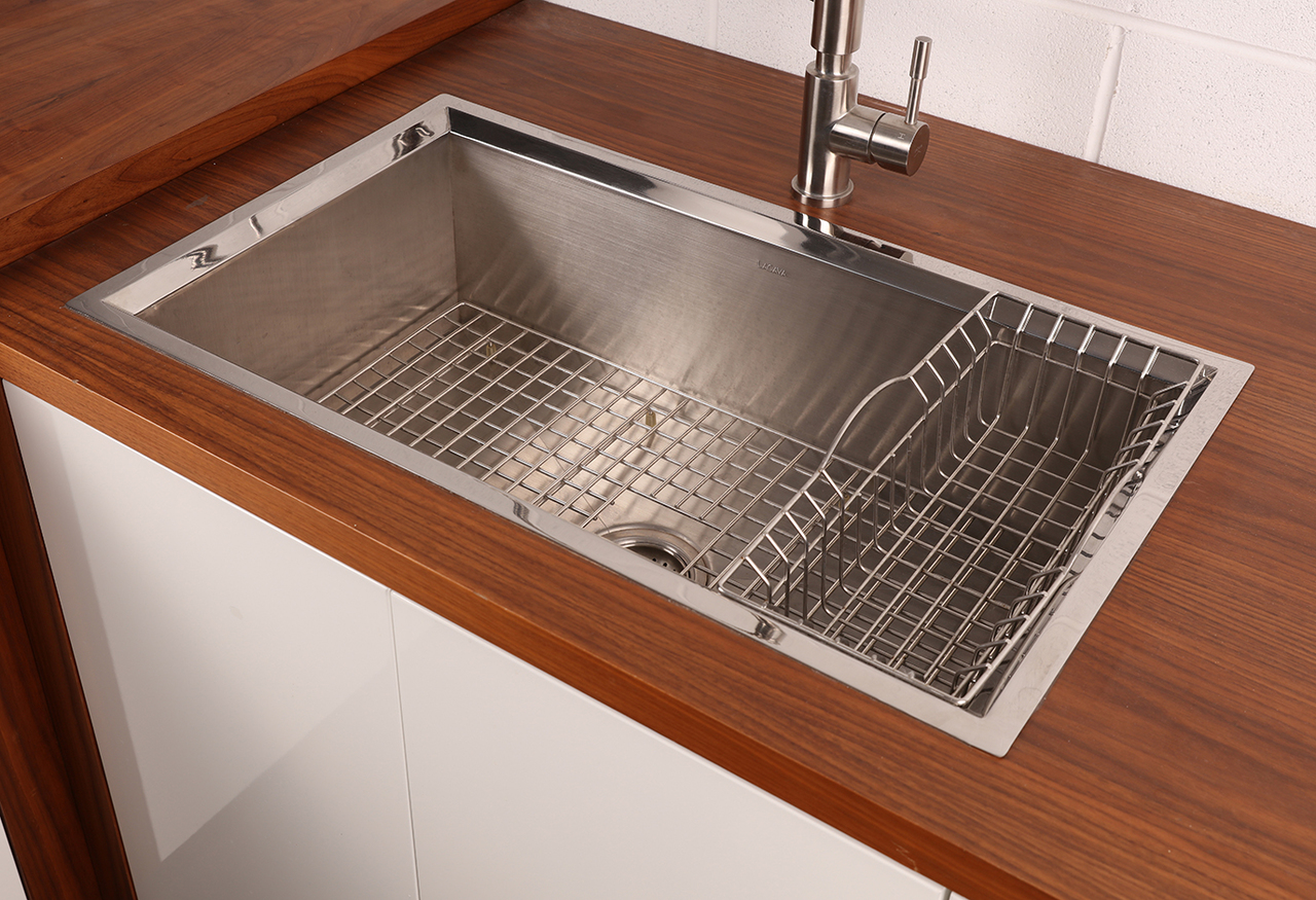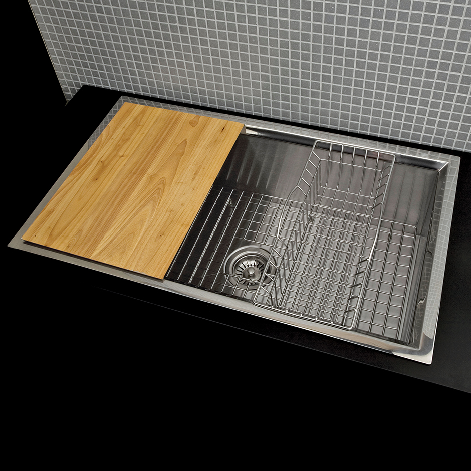 Under-counter or self-rimming drop in kitchen sink without an overflow. 16 gauge stainless steel. Includes drain, bottom rack, hanging grid basket, and wooden cutting board.